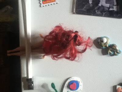That is a naked Barbie forcefully lodged in the refrigerator door… and the turtle seems interested in her predicament.